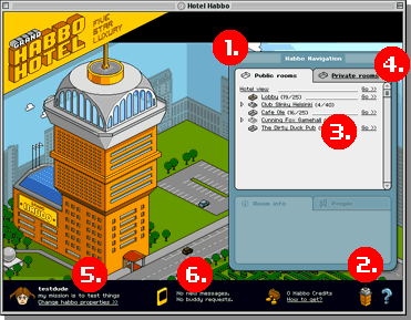 Ceci est la page principale de Habbo Hôtel. Ici, vous pouvez utiliser le Navigateur (1.) pour voir combien de personnes sont dans les différents espaces publics de l'hôtel et avoir un coup d'oeil sur le nombre de personnes dans les apparts privés.