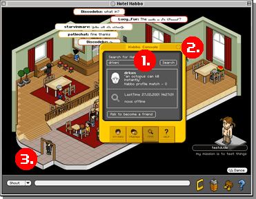 Vous cherchez quelqu'un? Si vous voulez savoir où est un Habbo en particulier, il suffit de taper son nom dans la zone en haut de l'écran et cliquez sur «recherche» (1.). Vous serez en mesure de savoir leurs dernières connexions à l'Hôtel et où ils sont maintenant.