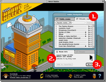 De retour sur la vue aérienne, vous pouvez visiter les chambres des autres. Sur le Navigateur, cliquez sur l'onglet «Apparts privés" (1.). Cela fera apparaître un écran de recherche répertoriant les 11 chambres les plus populaires (ouverte).