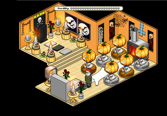 - Des citrouilles - Des toiles d'araignée - Des chaînes - Des bougeoirs crâne - Des Grolapins - Des fauteuils Globos Un appart très Habboween... Ca fait froid dans le dos ! |