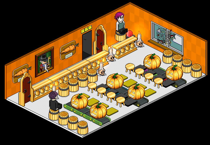 1.Quatre joueurs entrent et s'installent chacun sur un tabouret-baril. 2.Dès que L@loo a déclenché l'alarme et qu'elle s'allume, les 4 joueurs doivent faire le parcours qui les mènent à l'autre bout de la salle en restant bien dans leur ligne. Ils doivent s'asseoir sur les barils qui sont en face de ceux du départ avant de faire le retour. 3.A chaque partie, un finaliste est désigné : c'est celui qui arrive à faire l'aller-retour en premier. 4.Dès qu'il y a 4 finalistes, une finale est organisée :) 5.Le Habbo gagnant est celui qui remporte la finale. |
