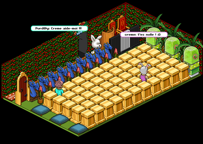 1. Trois joueurs entrent et s'installent chacun sur un coussin du Conseil invisible. 2. Dès que le "GO" de flash95600, vous devez essayé d'avancer en cliquant sur le sol : ATTENTION... des tabourets se cachent sous les coins Rustico mais pas sous tous... 3. Vous devez aller jusqu'au Habbo Cola qui est en face de votre coussin, vous servir un cola et refaire la course dans le sens inverse pour retourner à votre coussin de départ. 4. Le gagnant est celui qui revient à sa place en ayant fait l'aller-retour et en ayant un Cola en main ;) BONNE CHANCE ! |